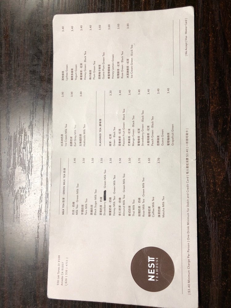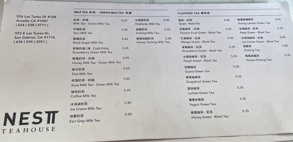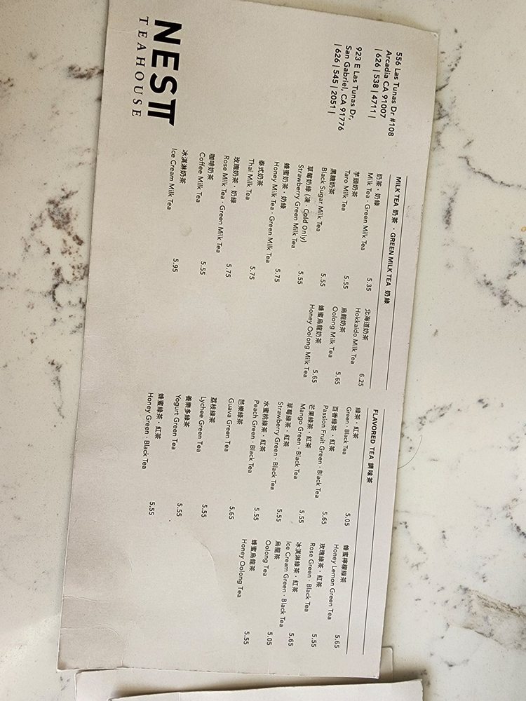 Nest Tea House, located in Arcadia, CA, is a hidden gem for tea lovers. This cozy spot offers a wide range of milk teas, green teas, and unique milkstache teas. Customer reviews rave about the consistent flavors, friendly staff, and peaceful ambiance. Standouts on the menu include the Hokkaido Milk Tea, Rose Green Milk Tea, and Guava Green Tea. The option to customize sweetness levels adds a personal touch to each drink. With amenities like free Wi-Fi, gender-neutral restrooms, and outdoor seating, Nest Tea House creates a welcoming environment for customers to relax or work. If you're looking for a refreshing and flavorful tea experience, Nest Tea House is a must-visit spot in the 626 area.